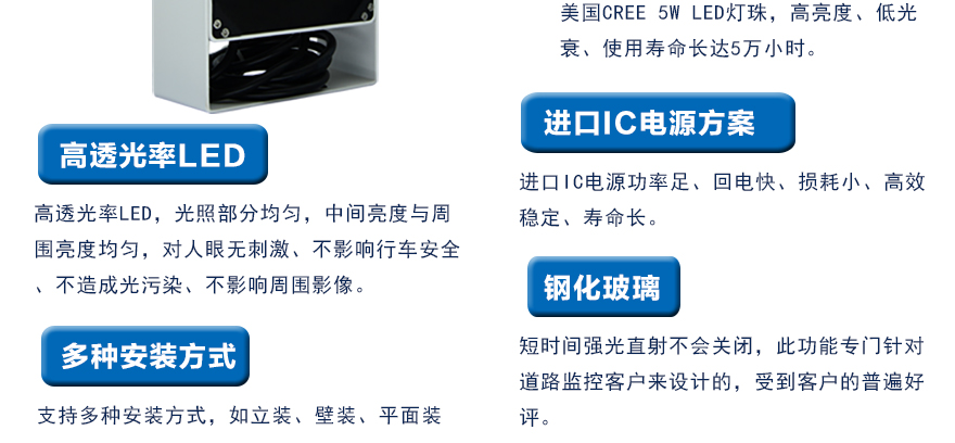 ★功率可調,根據現場光照環境調節燈光亮度,在滿足圖像效果的前提下盡量減少光功率,節能環保;